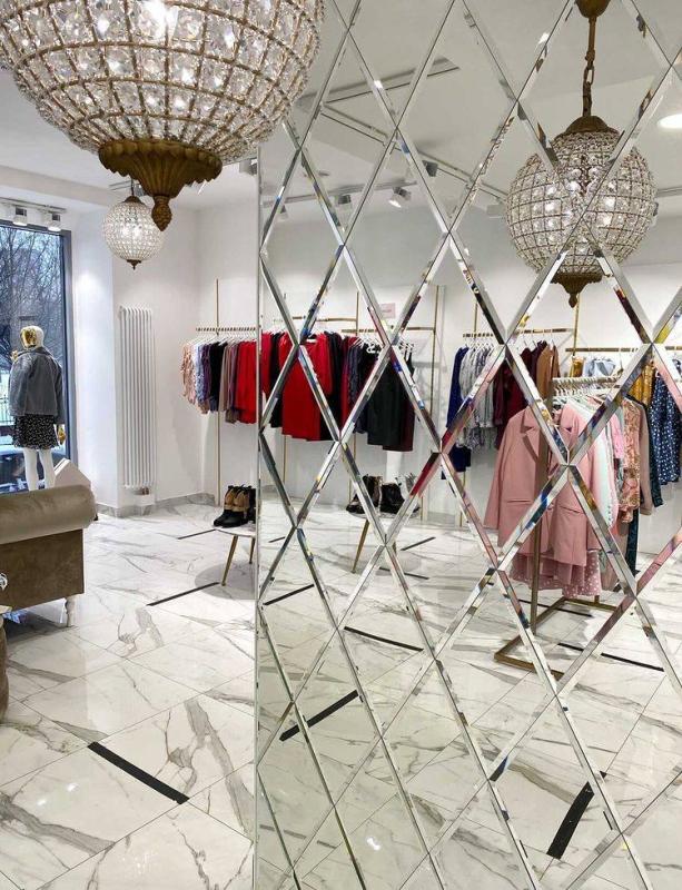 Использована зеркальная квадратная плитка с фацетом.